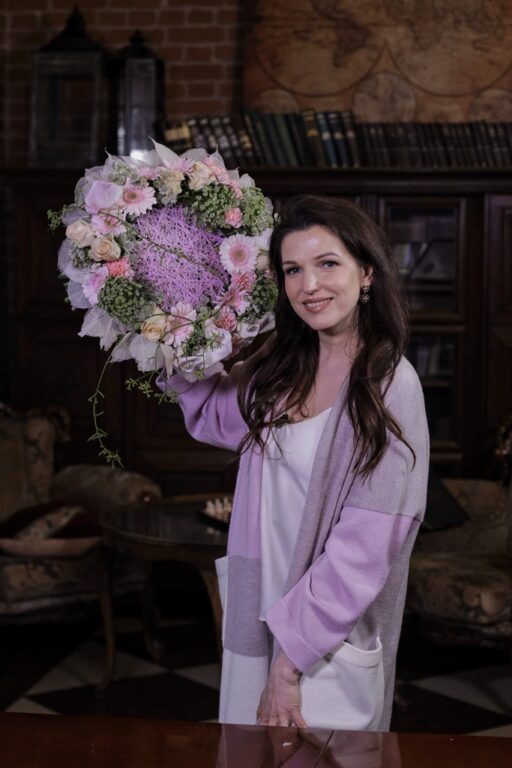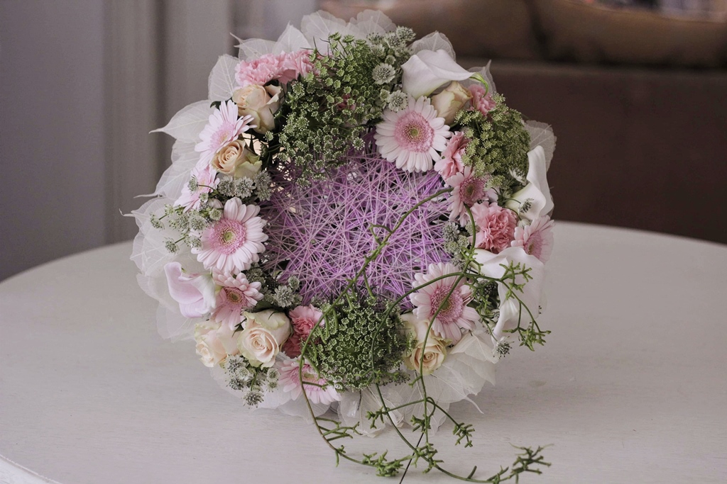 Ji sukurs gaivią, šviesią, švelnių spalvų puokštę, kurioje harmoningai derės visa žiedų ir žalumos paletė: gvazdikai, kalijos, astrancijos, rožės, gerberos, ripsaliai. Iš floristinių vielučių sukurto karkaso vidurys bus dekoruotas siūlais, karkaso šonus papuoš skeletono lapai. Šalia jų savo vietą ras ir žiedai, kurie kartu sukurs švelnumo ir trapumo įspūdį.