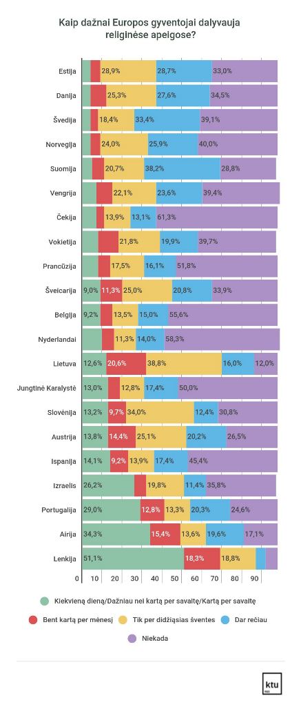 Lietuvoje bent kartą per savaitę religinėse apeigose dalyvauja 12,6 proc. gyventojų (sujungti atsakymų variantai „Kiekvieną dieną“, „Dažniau nei kartą per savaitę“, „Kartą per savaitę“), tad esame daugmaž viduryje tarp kitų tyrime dalyvavusių šalių.