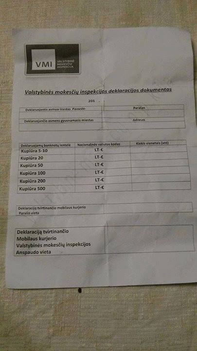 Valstybinė mokesčių inspekcija prie Lietuvos Respublikos finansų ministerijos (toliau – VMI) informuoja, kad apsimesdami mokesčių inspekcijos darbuotojais gyventojus lanko sukčiai, siūlydami namie laikomų pinigų surašymo paslaugą. Sukčiai netgi atsineša falsifikuotą deklaraciją „Valstybinės mokesčių inspekcijos deklaracijos dokumentas“, į kurią turėtų surašyti turimus litų ir eurų banknotus.