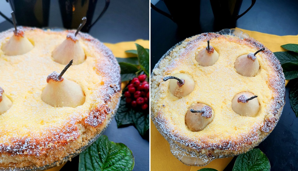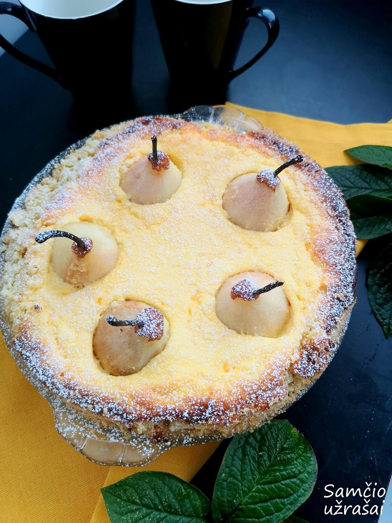 Iš tešlos iškočiokite apskritą lakštą ir įtieskite į kepimo indą, suformuodami šonus. Supilkite varškės masę ir sustatykite kriaušes.