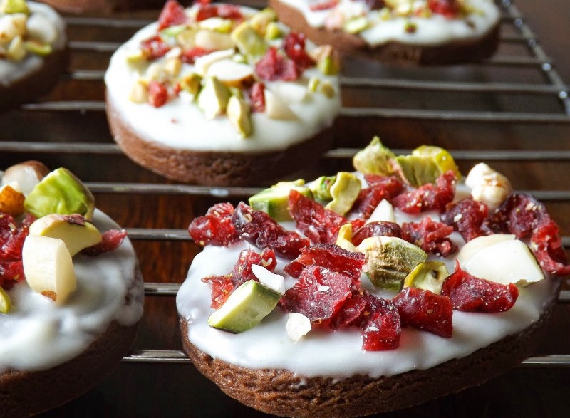 - Sutepkite kiekvieno sausainio vieną pusę lydytu šokoladu, užbarstykite smulkintų riešutų ir spanguolių ant viršaus.