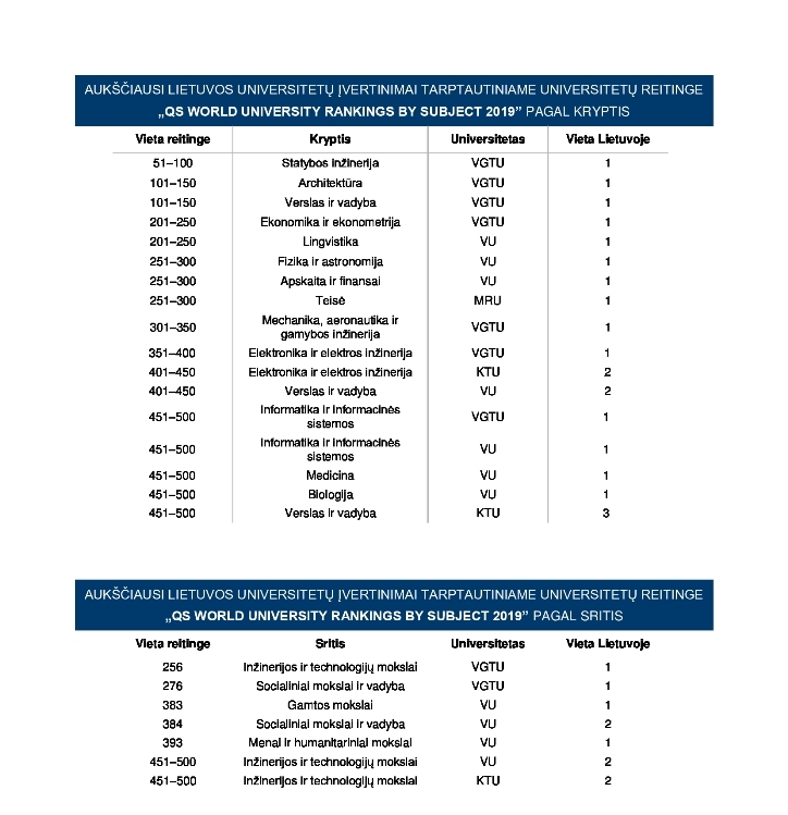 Pirmą kartą Lietuvos universitetas pateko tarp 100 geriausiųjų pasaulio universitetų vienoje iš krypčių inžinerijos ir technologijų srityje. Tokie rezultatai paaiškėjo vasario 27 d. paskelbus tarptautinio universitetų reitingo „QS World University Rankings by Subject 2019“ rezultatus. Į šį reitingą šiemet pateko 4 Lietuvos aukštosios mokyklos, kurios buvo vertintos pagal skirtingas mokslo ir studijų kryptis bei sritis.
