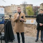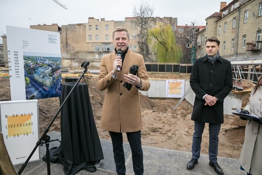 Šiandien „Live Square“ kūrimo erdvės startą paskelbė J. Urbonas, menininkas, tyrėjas, inžinierius, Vilniaus dailės akademijos prorektorius, Londono karališkojo meno koledžo doktorantas. Jis kapsulę-plytą į statomos „Live Square“ sieną „įmūrijo“ levituodamas, t. y. horizontaliai eidamas pastato pamatais.