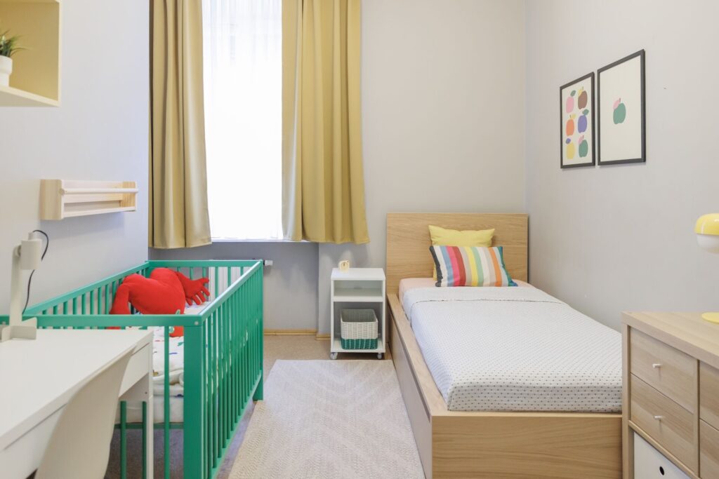 Atnaujintame kambaryje erdvė padalyta į keturias pagrindines zonas. Vaikų miegui pritaikyta dviaukštė lova – toks sprendimas leidžia sutaupyti vietos ir taip nedidelėje patalpoje. Kitų šeimos narių miegui parinkta patogi sofa-lova. Ryškių spalvų kūdikio kampelis suteikia saugią vietą patiems mažiausiems, o kompaktiškas prieškambaris su daiktų laikymo sprendimais padeda palaikyti tokioje aplinkoje būtiną tvarką.