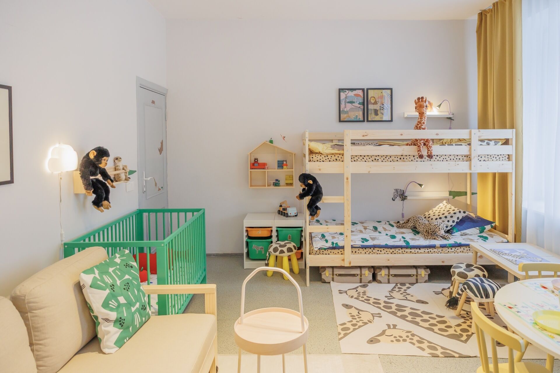 Atnaujintame kambaryje erdvė padalyta į keturias pagrindines zonas. Vaikų miegui pritaikyta dviaukštė lova – toks sprendimas leidžia sutaupyti vietos ir taip nedidelėje patalpoje. Kitų šeimos narių miegui parinkta patogi sofa-lova. Ryškių spalvų kūdikio kampelis suteikia saugią vietą patiems mažiausiems, o kompaktiškas prieškambaris su daiktų laikymo sprendimais padeda palaikyti tokioje aplinkoje būtiną tvarką.