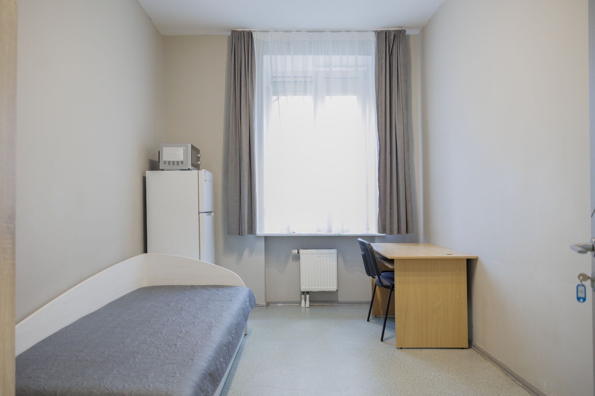 Dar vienas pakeitimas šiame interjere – spinta, kurioje telpa ne tik asmeniniai daiktai, bet ir būtinoji buitinė technika: šaldytuvas bei mikrobangų krosnelė. Tai leidžia šeimai turėti daugiau savarankiškumo net ir laikino gyvenimo sąlygomis. Erdvės dydžiui ir įvairiems poreikiams pritaikytas apšvietimas, atskiri šviestuvai įrengti vaikų ir valgymo zonose – tai leidžia sutelkti šviesą būtent ten, kur jos tuo metu reikia.