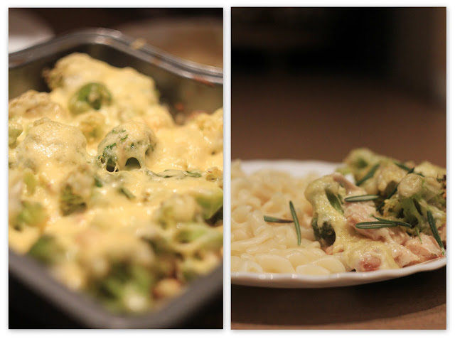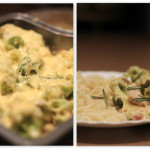 Sumaišome vištieną su puse Bešamelio padažo. Sudedame į kepimo formą. Paskirstome brokolius ir apipilame likusiu padažu.