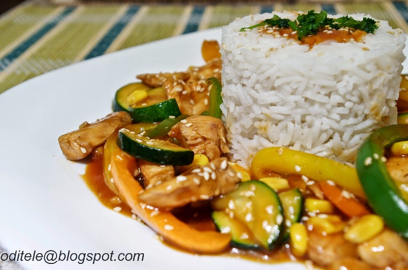 Į tą pačią keptuvę, kur kepė vištiena, įpilkite šauktą aliejaus. Daržoves kepti reikia neilgai, kad visos išliktų traškios. Trumpai pakepdami ir pamaišydami dėkite tokiu eiliškumu: morkas, svogūnus, imbierą, česnaką, paprikas ir cukiniją. Tuomet sudėkite keptą vištieną, medų, pomidorų padažą ir gerai išmaišykite. Keptuvę nukelkite nuo ugnies ir suberkite konservuotus kukurūzus, išmaišykite.