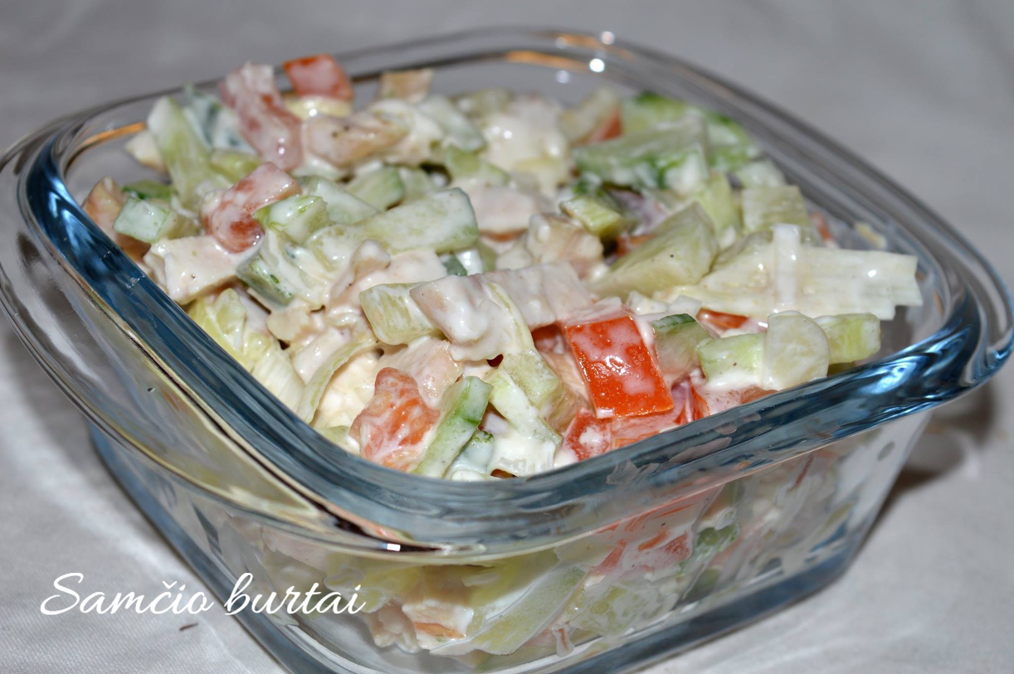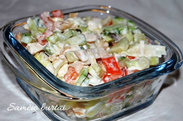Vištos krūtinėlę išverdame ir atvėsiname. Susmulkiname nedideliais kubeliais. Taip pat susmulkiname pomidorą, agurką ir papriką. Poro baltąją dalį supjaustome žiedeliais. Beriame druską, pipirus, dedame majonezą ir gerai išmaišome.