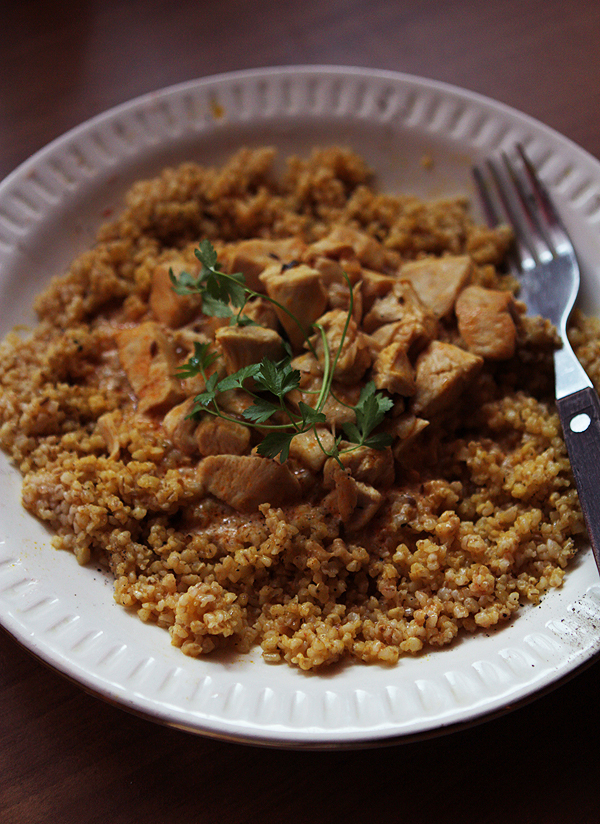 Į kitą keptuvę supilame likusią dalį palmių aliejaus ir apkepiname smulkintą svogūną. Sudedame vištieną ir kepiname apie 6–7 minutes. Tada sudedame ją į puodą, skirtą troškinimui. Įdedame du šaukštus grietinės, pomidorų tyrės, įpilame šlakelį vandens (apie 50 g), šlakelį tabasko padažo, beriame druskos, rudojo cukraus, kuminų, kario, raudonėlių. Troškiname apie 15–20 minučių ant silpnos ugnies.