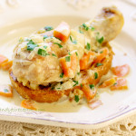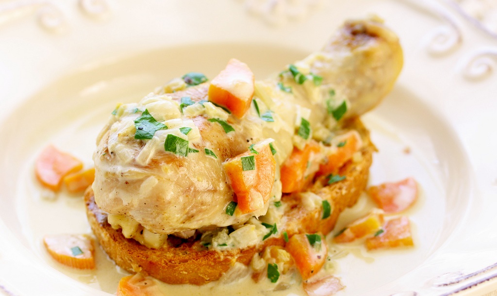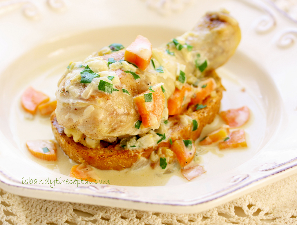 Šiuo padažu užpilkite vištos šlauneles taip, kad skrudinta duona sudrėktų ir suminkštėtų.