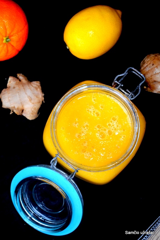 Dedame po šaukštą medaus, ragaujame, kad nebūtų per saldu (man prireikė 3 šaukštų medaus), ir gerai išplakame.