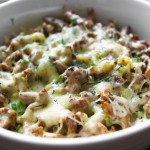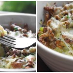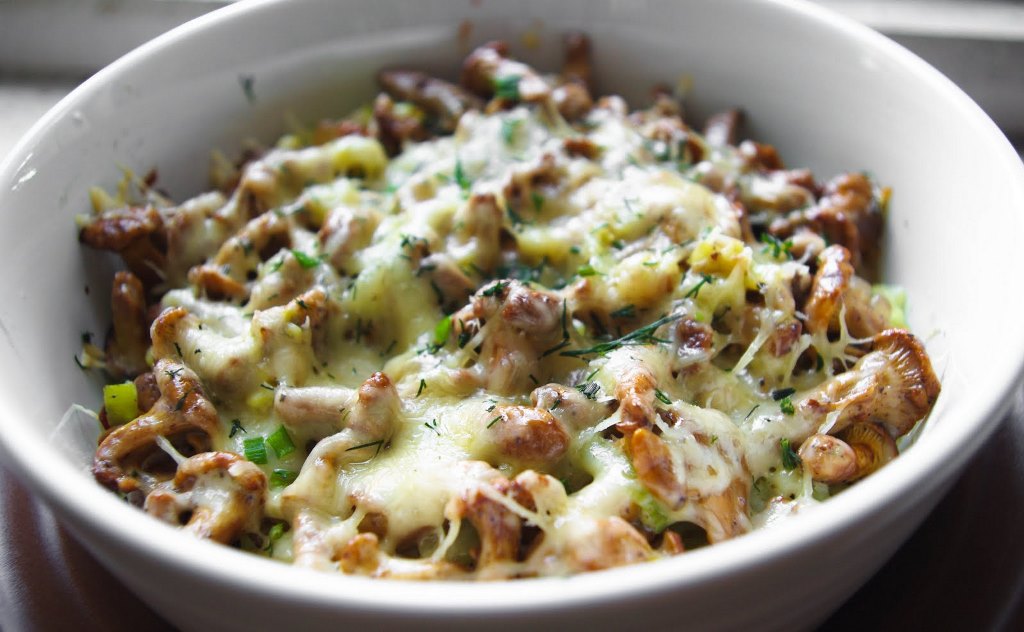 Virtas bulves sutarkuojame burokine tarka, dedame į kepimo indelį. Ant viršaus pilame su spirgučiais, svogūnais, grietinėle patroškintas prieskoniais pagardintas voveraites. Užberiame tarkuotą fermentinį sūrį ir dedame kepti į orkaitę. Paskaniname krapais bei svogūnų laiškais.