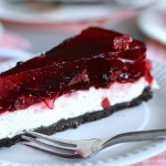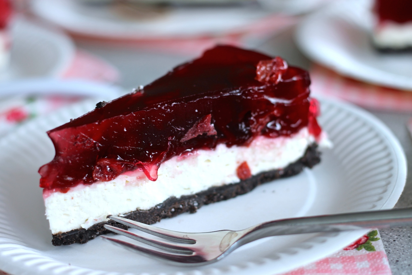 Abiejų pakelių želės miltelius užpilame verdančiu vandeniu ir maišome, kol visa želatina ištirpsta. Paliekame atvėsti. Įmaišome vyšnių įdarą. Viską supilame ant sustingusio varškės sluoksnio ir statome į šaldytuvą, kad pyragas visiškai sustingtų. Skanaus!