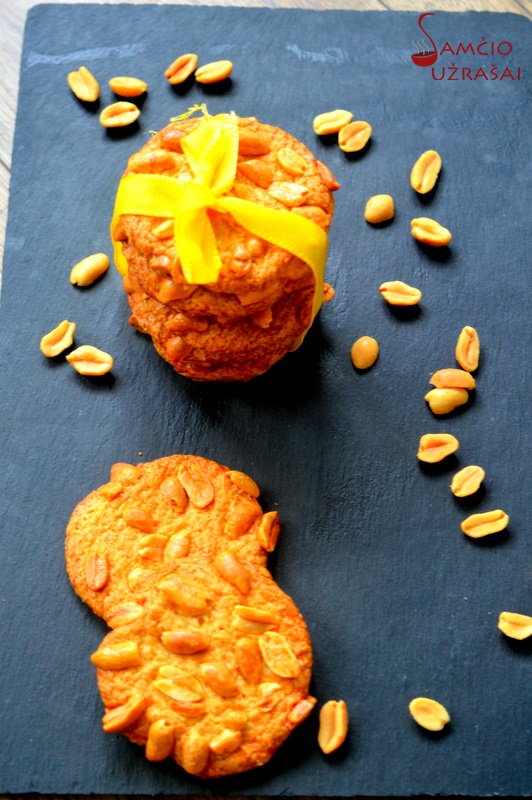 Suformuokite plokščius sausainius, sudėkite į skardą, išklotą kepimo popieriumi, įspauskite likusius žemės riešutus ir kepkite iki 180 °C temperatūros įkaitintoje orkaitėje apie 15 min. Atvėsinkite.
