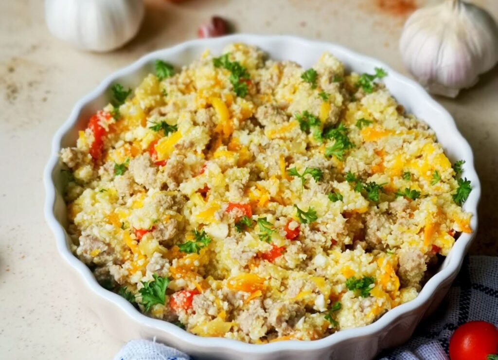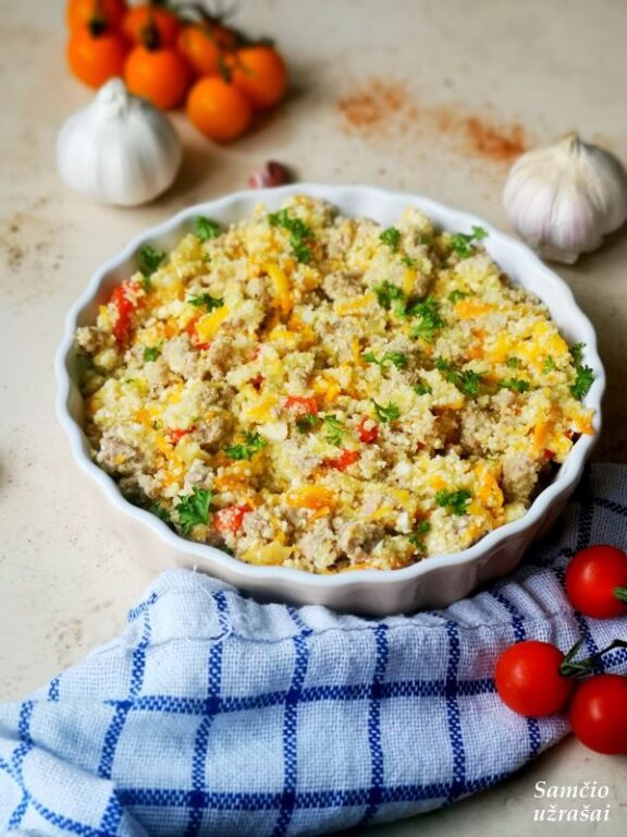 Žiedinį kopūstą išskirstykite žiedynais ir sudėkite į virtuvinį kombainą. Susmulkinkite. Keptuvėje su aliejumi pakepinkite kubeliais supjaustytus svogūną ir papriką, tarkuotą morką. Kai daržovės suminkštės, dėkite maltą mėsą ir pakepinkite, kol mėsa sušoks į mažus gabaliukus. Dėkite išspaustą česnaką, paprikos miltelius, druską, žiedinį kopūstą, įpilkite ½ stiklinės vandens arba sultinio ir troškinkite, kol skystis susigers (apie 7 min.). Patiekite iš karto.