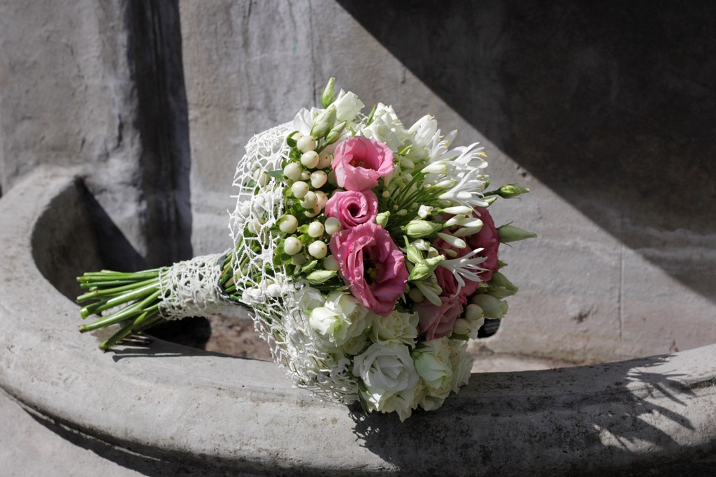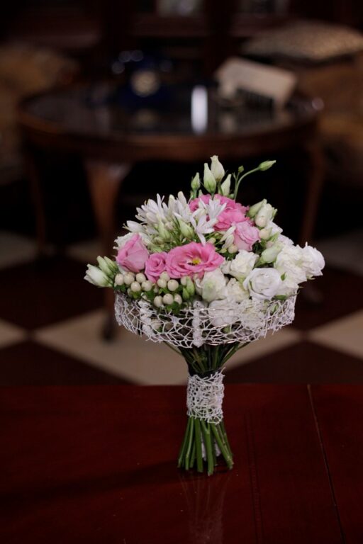 Išskirtinės nuotakos puokštės pagrindu taps baltas, grakštus karkasas, dekoruotas elegantiška mezginių juostele. Jį puoš daug baltų gėlių: agapantai, hiperikų uogytės, eustomos, smulkiažiedės rožės, o akcentu taps švelniai rausvi eustomų žiedai.