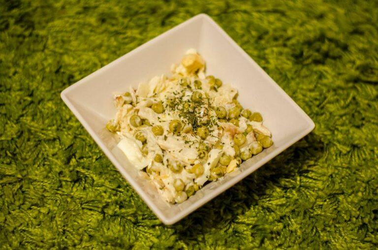 Rūkytą menkę atsargiai suplėšykite gabaliukais, išrankiodami kauliukus. Kietai išvirkite kiaušinius, smulkiai supjaustykite svogūną ir jį šiek tiek pakepinkite. Į rūkytą menkę suberkite žirnelius, sudėkite kepintus svogūnus ir susmulkintą virtą kiaušinį. Išmaišykite su majonezu ir ragaukite.