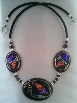 Šį kartą piešinio dominantė yra paukštis. Nuo seniausių laikų šis vaizdinys siejamas su prisikėlimo, atgimimo simboliu. Ž. Navikaitės papuošaluose paukščio interpretacija dėl jos poetiškos vaizduotės praplečia tradicinį simbolio suvokimo lauką. Stilizuoti piešinio segmentai, tokie kaip paukštis, mėnulis, gali būti įvairiai perfrazuojami, išprovokuoti atradimų ar dialogų.