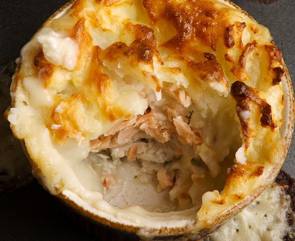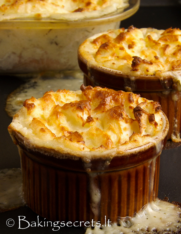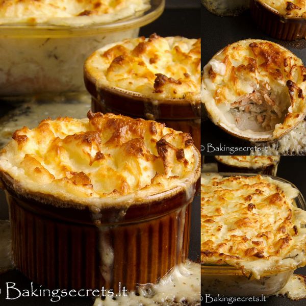 Žuvies pyragas su bulvių košės plutele ir labai skaniu padažu.